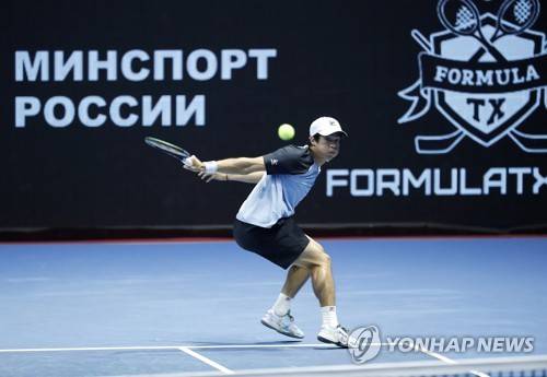 epa09546933 Mackenzie McDonald of USA in action against Egor Gerasimov of Belarus during their first round match of the St.Petersburg Open ATP tennis tournament in St.Petersburg, Russia, 26 October 2021. EPA/ANATOLY MALTSEV
