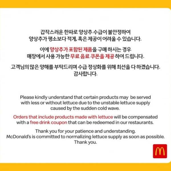 앞서 한국맥도날드는 지난 21일 홈페이지를 통해 "갑작스러운 한파로 양상추 수급이 불안정해 양상추가 평소보다 적게, 혹은 제공이 어려울 수 있다"고 공지했습니다.