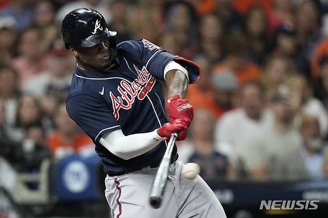 [휴스턴=AP/뉴시스] 애틀랜타 브레이브스의 호르헤 솔레어가 26일(현지시간) 미 텍사스주 휴스턴의 미닛 메이드 파크에서 열린 2021 메이저리그 월드시리즈(WS·7전4선승제) 1차전 휴스턴 애스트로스와의 경기 1회 초 선두타자로 나와 홈런을 치고 있다. 솔레어는 월드시리즈 사상 첫 1회 초 선두타자 홈런을 때려낸 선수가 됐다. 애틀랜타는 1차전을 6-2 승리로 장식해 먼저 1승을 따냈다. 2021.10.27.