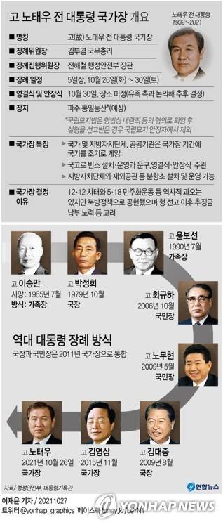 (서울=연합뉴스) 김병규 김기훈 이슬기 기자 = 노태우 전 대통령 장례가 닷새간 국가장으로 치러진다. 장례를 주관하는 장례위원장을 김부겸 국무총리가 맡는다.