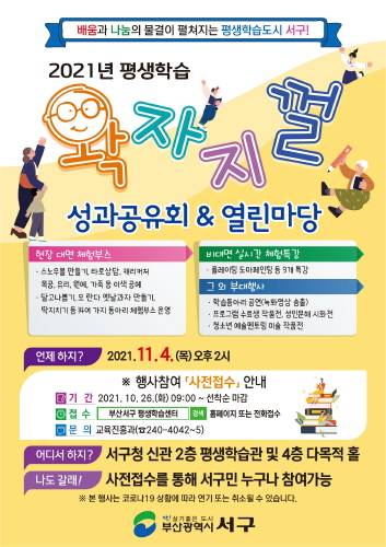 부산 서구(구청장 공한수)는 오는 11월 4일 오후 2시 구청 신관 2층 평생학습관과 4층 다목적홀에서 평생학습 열린마당 & 성과공유회를 개최한다.