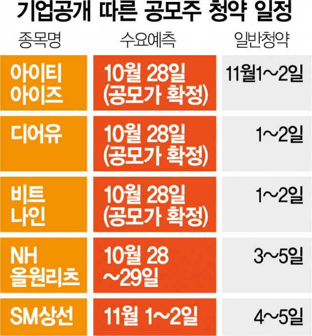 SM상선과 디어유뿐 아니라 아이티아이즈(11월 1~2일)와 비트나인(11월 1~2일), 지오엘리먼트(11월 2~3일), NH올원리츠(3~5일)도 일반 청약을 준비 중이다. 이들 기업 역시 카카오페이 증거금 환불 이후로 청약 일정을 잡아 ‘머니 무브’ 효과를 기대했다는 관측이다.