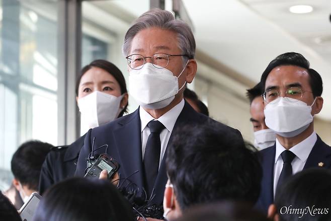 | ▲ 이재명 더불어민주당 대선후보가 27일 서울 종로구 서울대학교병원 장례식장에 마련된 노태우씨 빈소를 조문한 뒤 기자들의 질문에 답변하고 있다. |