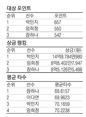 '최저 타수상' 부문은 평균 69.6157타로 1위에 올라 있는 장하나(29·비씨카드)가 가장 유리하다. '디펜딩 챔피언' 자격으로 출전하는 장하나는 이번 대회 우승으로 '개인 통산 20승'을 노린다. 장하나는 KLPGA 15승, LPGA 4승을 기록하고 있다. 장하나는 "욕심을 부리기보다는 열심히 치면 우승은 따라올 것이다. 최근 망가졌던 스윙이 지난주 대회에서 다시 올라왔는데, 이번주에 그 감을 최대한 이어서 멋진 플레이를 하고 싶다"고 밝혔다.