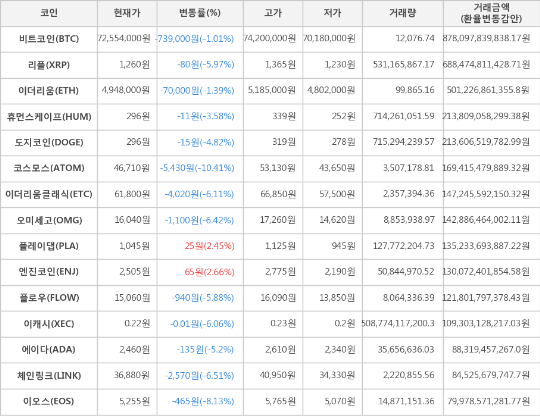 또한, 이오스(-8.13%, 5,255원), 체인링크(-6.51%, 36,880원), 오미세고(-6.42%, 16,040원), 이더리움클래식(-6.11%, 61,800원), 이캐시(-6.06%, 0.22원), 리플(-5.97%, 1,260원), 플로우(-5.88%, 15,060원), 에이다(-5.2%, 2,460원), 도지코인(-4.82%, 296원), 휴먼스케이프(-3.58%, 296원), 이더리움(-1.39%, 4,948,000원)이 하락세를 나타냈다.