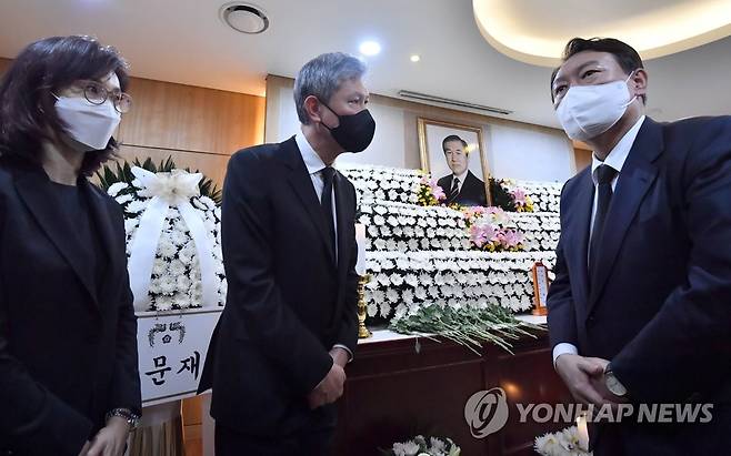 (서울=연합뉴스) 국민의힘 윤석열 대선 경선 후보가 27일 오후 서울대병원 장례식장에 마련된 노태우 전 대통령 빈소를 찾아 조문을 마친 뒤 유족인 노재헌 동아시아문화센터 이사장과 인사하고 있다. 2021.10.27 [사진공동취재단]