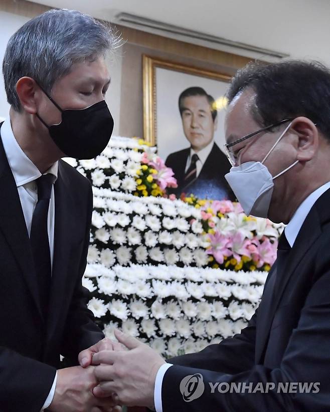 (서울=연합뉴스) 김부겸 국무총리가 27일 서울 종로구 서울대병원 장례식장에 마련된 고(故) 노태우 전 대통령 빈소를 찾아 조문을 하고 있다. 2021.10.27 [사진공동취재단]