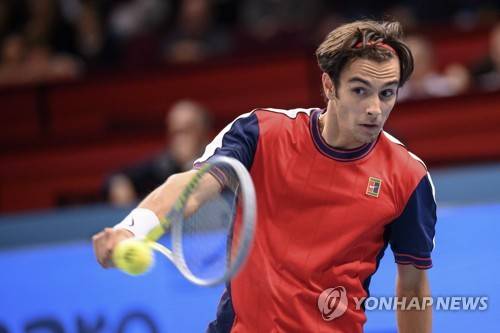 epa09548911 Lorenzo Musetti of Italy in action during his first round match against Gael Monfils of France at the Erste Bank Open ATP tennis tournament in Vienna, Austria, 27 October 2021. EPA/CHRISTIAN BRUNA