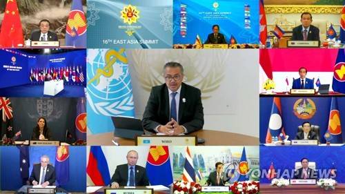 epa09549013 A handout photo made available by the Brunei ASEAN Summit Host Photo shows WHO Director-General Tedros Adhanom Ghebreyesus (C) attending the ASEAN - East Asia Summit on the sidelines of the Association of Southeast Asian Nations (ASEAN) summit with the leaders member? states in Bandar Seri Begawan, Brunei, 27 October 2021. Southeast Asian leaders from the 10-nation bloc commence their three-day virtual ASEAN Summit hosted by Brunei from 26 October 2021 without Myanmar?s top general Min Aung Hliang while US President Joe Biden will lead the US-delegation attending the meetings. EPA/BRUNEI ASEAN SUMMIT 2021 / HANDOUT HANDOUT EDITORIAL USE ONLY/NO SALES