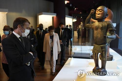 French President Emmanuel Macron, left, watches the 19th century royal statue of a half-man half-bird, left, of King Ghezo, at the Quai Branly museum Wednesday, Oct. 27, 2021 in Paris. France next month will hand over 26 looted colonial-era artifacts to the government of Benin – some of the estimated 90,000 African artworks held in French museums.(AP Photo/Michel Euler, Pool) POOL PHOTO