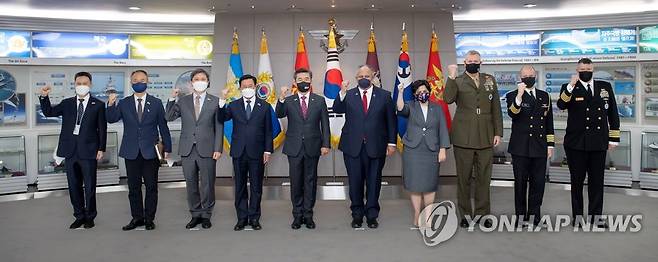 (서울=연합뉴스) 서욱 국방부 장관(왼쪽 다섯 번째)이 28일 서울 용산 국방부 청사에서 방한 중인 카를로스 델 토로 미국 해군성 장관(왼쪽 여섯 번째) 일행과 기념 촬영하고 있다. 2021.10.28