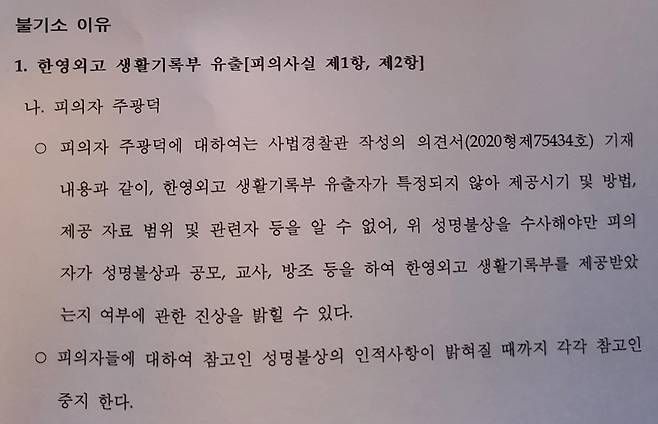 검찰은 결정서에서 "피의자 주광덕에 대해 한영외고 학생부 유출자가 특정되지 않아, 위 성명불상을 수사해야만 피의자가 성명불상과 공모, 교사, 방조 등을 했는지 여부에 관한 진상을 밝힐 수 있다"면서 "피의자에 대해 참고인 성명불상의 인적사항이 밝혀질 때까지 각각 참고인중지한다"고 밝혔다. 이는 '학생부를 주 전 의원에게 제공한 자가 누구인지 몰라 주 전 의원을 불기소 처분한다'는 뜻이다.