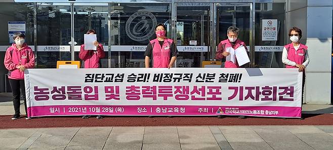 전국학교비정규직노조 충남지부(아래 충남학비노조)는 농성에 돌입하기에 앞서 이날 기자회견을 열고 "협상 시까지 무기한 천막농성에 돌입하겠다"고 선포했다.