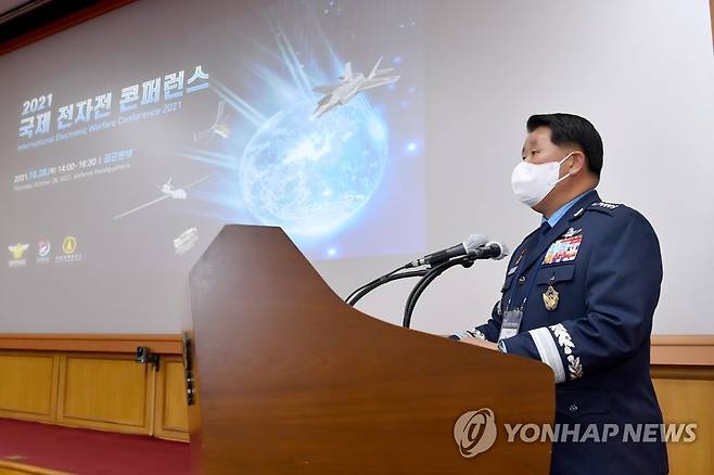 (서울=연합뉴스) 박인호 공군참모총장이 28일 공군본부 대회의실에서 전자전 발전과 국제협력 강화를 위해 국방과학연구소, 국제전자전협회와 공동으로 개최한 '2021 국제 전자전 콘퍼런스'에 참석해 개회사를 하고 있다. 2021.10.28