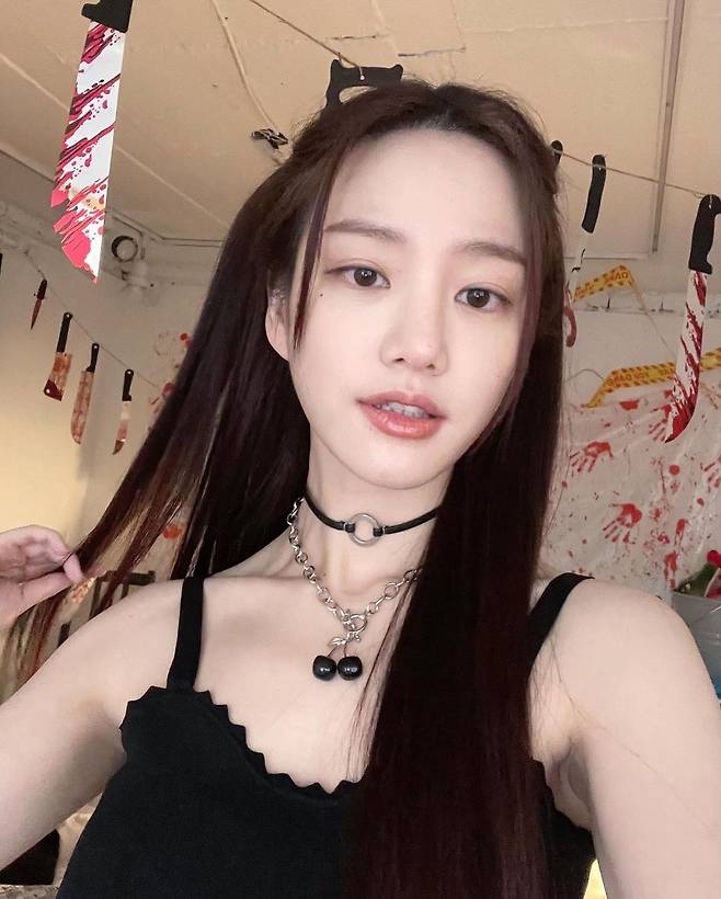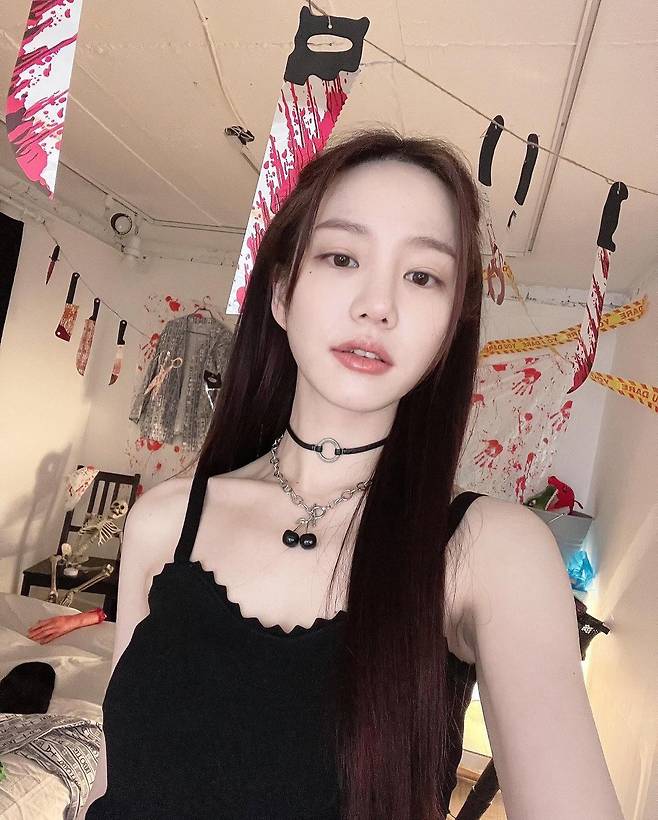 공개된 사진 속에는 핼러윈데이를 맞아 일본 애니메이션인 '데스노트'의 미사로 분장한 이유비의 모습이 담겼다. 이때 이유비의 뒤로 피 묻은 칼이 주렁주렁 달려있는 모습이 포착돼 눈길을 끌었다.