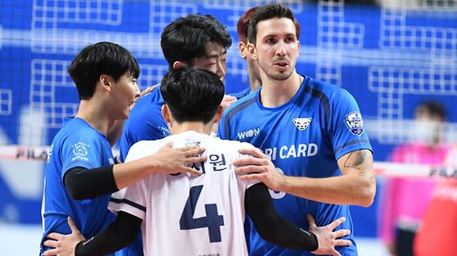 우리카드는 28일 서울 장충체육관에서 열린 도드람 2021-2022 V리그 남자부 홈경기에서 한국전력을 세트 스코어 3대 0(25-18 25-23 25-17)으로 완파했습니다.