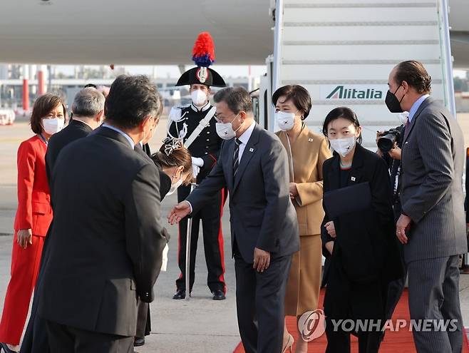 (로마=연합뉴스) 최재구 기자 = 문재인 대통령과 김정숙 여사가 주요 20개국(G20) 정상회의 참석과 교황청 공식방문을 위해 이탈리아 로마 피우미치노 국제공항에 도착, 환영인사들과 악수하고 있다. 2021.10.28