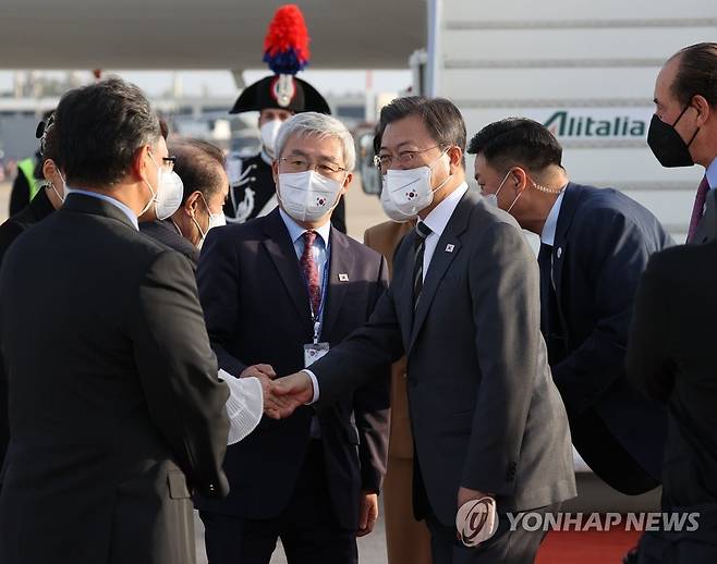 (로마=연합뉴스) 최재구 기자 = 문재인 대통령과 김정숙 여사가 주요 20개국(G20) 정상회의 참석과 교황청 공식방문을 위해 이탈리아 로마 피우미치노 국제공항에 도착, 이탈리아측 환영인사들과 악수하고 있다. 2021.10.28