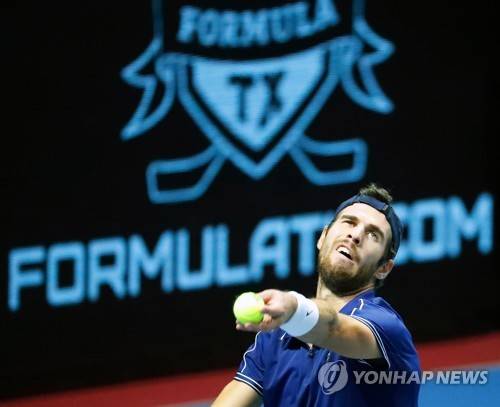 epa09550842 Karen Khachanov of Russia in action against Marin Cilic of Croatia during their second round match of the St.Petersburg Open ATP tennis tournament in St.Petersburg, Russia, 28 October 2021. EPA/ANATOLY MALTSEV