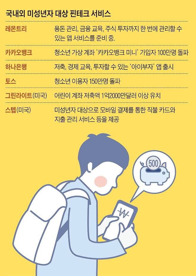 핀테크 업계에선 모바일에 익숙한 미성년자들의 첫 금융거래를 유치하기 위한 경쟁이 치열하다. 지난해 카카오뱅크가 만 14~18세 청소년을 대상으로 출시한 가상계좌 ‘카카오뱅크 미니’ 가입자는 1년 만에 가입자 100만명을 돌파했다. 이 연령대의 청소년이 233만명이라는 점을 감안하면 청소년 10명 중 4명이 이용하고 있는 셈이다. 은행 계좌가 없어도 돈을 보관하고 이체할 수 있고, 온·오프라인 결제도 가능하다. 핀테크 앱 토스의 청소년 이용자도 150만 명에 달한다.