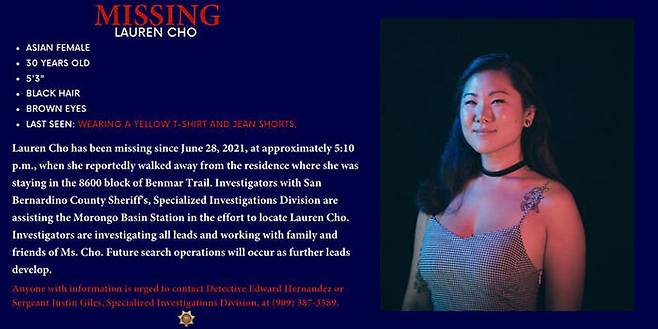 미국 캘리포니아주 샌버너디노카운티 검시소는 한국계 미국인 30살 로런 조 씨의 실종 장소 근처에서 발견된 유해가 조 씨로 확인됐다고 밝혔습니다.