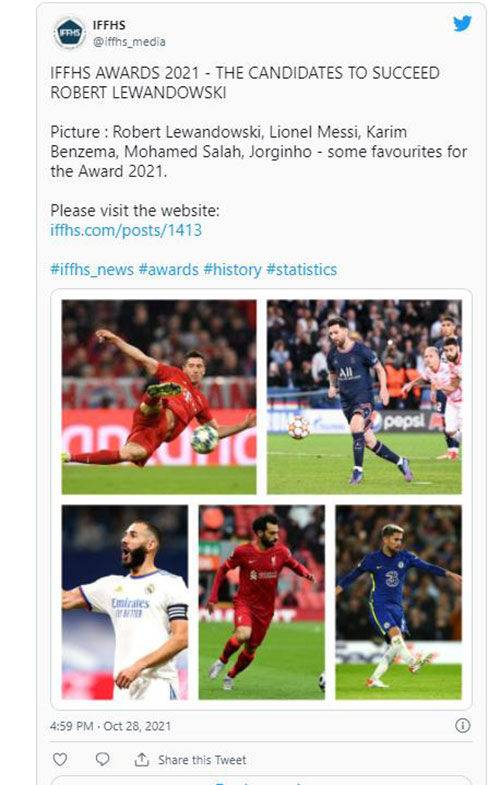 2021년 IFFHS 최우수 남자선수 후보 명단에는 지난해 수상자인 로베르토 레반도프스키(바이에른 뮌헨)를 비롯해 리오넬 메시, 네이마르, 킬리안 음바페(이상 파리 생제르맹), 크리스티아누 호날두(맨체스터 유나이티드), 케빈 더 브라위너(맨체스터 시티), 무함마드 살라, 사디오 마네(이상 리버풀), 엘링 홀란(도르트문트) 등 세계적 스타들이 들어 있습니다.