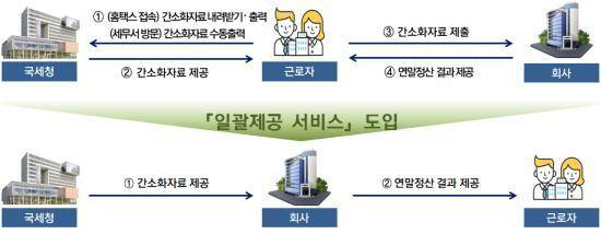 서비스 이용을 희망하는 근로자는 내년 1월 14일까지 회사에 일괄제공 신청서를 제출해야 하고, 회사는 신청자 명단을 국세청에 등록해야 합니다.