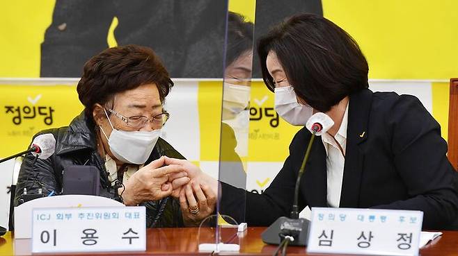 일본군 위안부 피해자이자 '일본군 위안부 문제 국제사법재판소(ICJ) 회부 추진위원회 대표'를 역임하고 있는 이용수 할머니는 오늘(29일) 국회를 찾아 여야 대선 주자 중 처음으로 심상정 정의당 대선 후보를 만났습니다.