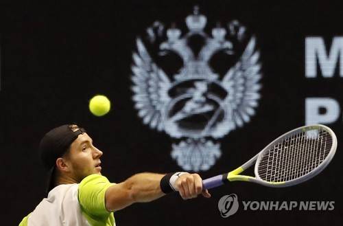 epa09552151 Jan-Lennard Struff of Germany in action against Denis Shapovalov of Canada during their quarterfinal match of the St.Petersburg Open ATP tennis tournament in St.Petersburg, Russia, 29 October 2021. EPA/ANATOLY MALTSEV