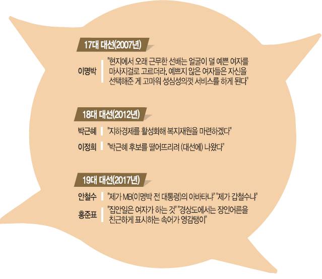 안 후보의 사례는 말실수가 대선의 향방을 갈랐던 경우다. 하지만 말실수가 큰 변수가 되지 못했던 경우도 있다. 17대 대선 때인 2007년 8월 이명박 당시 한나라당 후보는 ‘마사지걸’ 발언으로 논란을 빚었다. 그는 해외 근무 경험을 얘기하면서 “현지에서 오래 근무한 선배는 얼굴이 덜 예쁜 여자를 마사지걸로 고르더라”며 “예쁘지 않은 여자들은 자신을 선택해준 게 고마워 성심성의껏 서비스를 하게 된다”고 말했다. 당시 이 발언에 대한 비판이 거셌지만 20% 포인트 이상 벌어져 있던 정동영 당시 대통합민주신당 후보와의 지지율 격차는 좁혀지지 않았다. 이 격차는 대선까지 이어졌다.