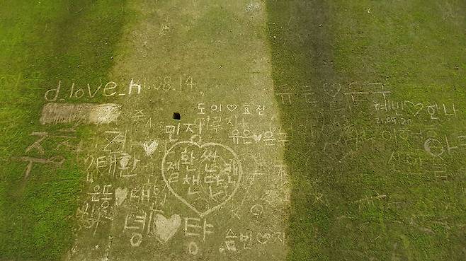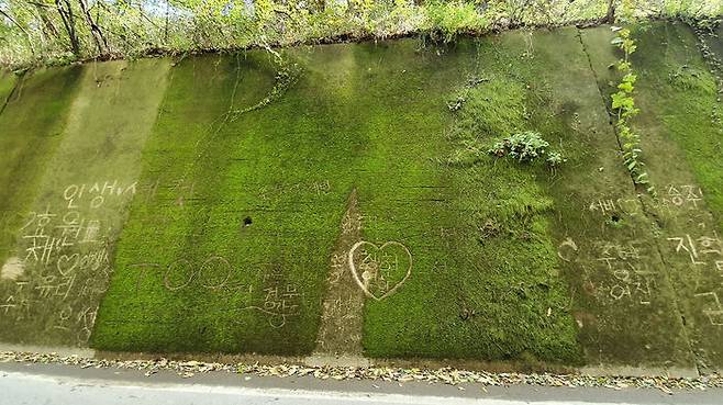 벽에는 하트 모양과 이름과 같은 낙서가 빼곡히 차 있고 손이 닿는 지점까지는 성한 데를 찾기 어려울 정도로 이끼 훼손이 심한 상태입니다.