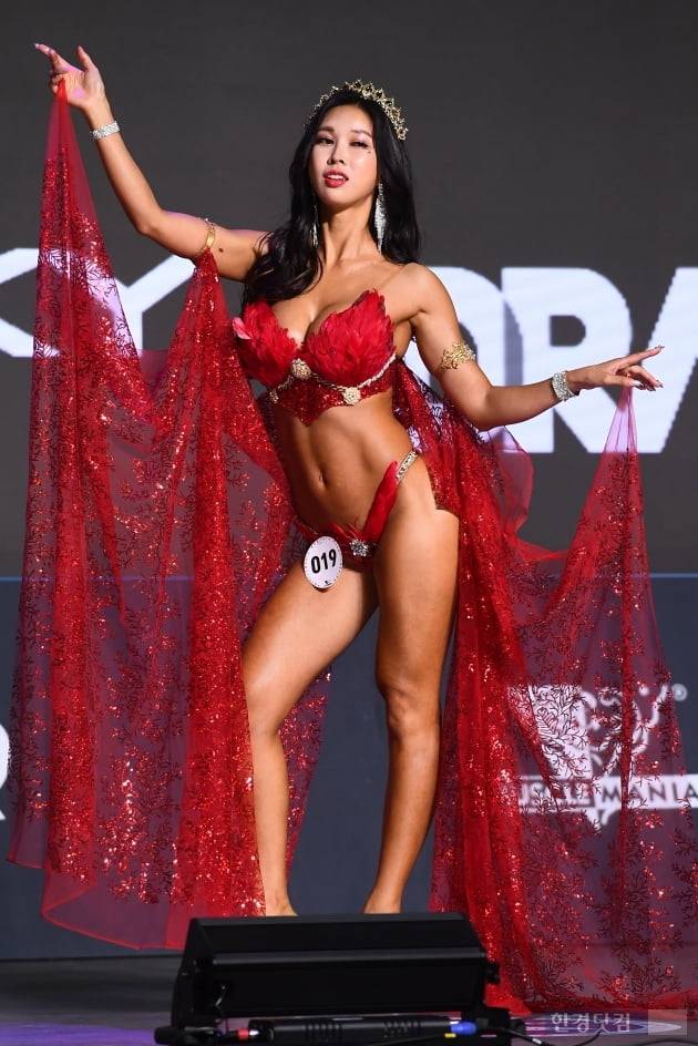 ‘갤러리K와 함께하는 2021 맥스큐 머슬마니아 오리엔트 챔피언십'이 30일 경기도 광명시 아이벡스 스튜디오에서 열렸다. 대회 '미즈비키니' 부문에 출전한 신은지가 포즈를 취하고 있다.