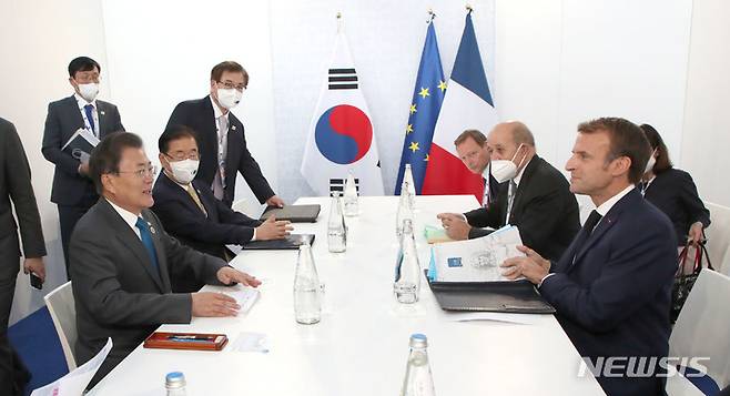 [로마=뉴시스] 김진아 기자 = 문재인 대통령과 에마뉘엘 마크롱 대통령이 30일(현지시간) 이탈리아 로마 누볼라 컨벤션 양자회담장에서 열힌 한-프랑스 정상회담을 하고 있다. 2021.10.30. bluesoda@newsis.com