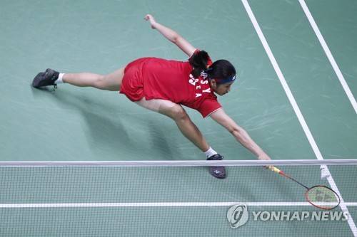 epa09554186 An Se-young of South Korea in action during her Women?s semifinal match against Akane Yamaguchi of Japan at the Yonex French Open 2021 tournament in Paris, France, 30 October 2021. EPA/YOAN VALAT