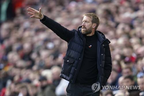 Brighton's head coach Graham Potter gestures during the English Premier League soccer match between Liverpool and Brighton and Hove Albion at Anfield Stadium, Liverpool, England, Saturday, Oct. 30, 2021. (AP Photo/Jon Super)