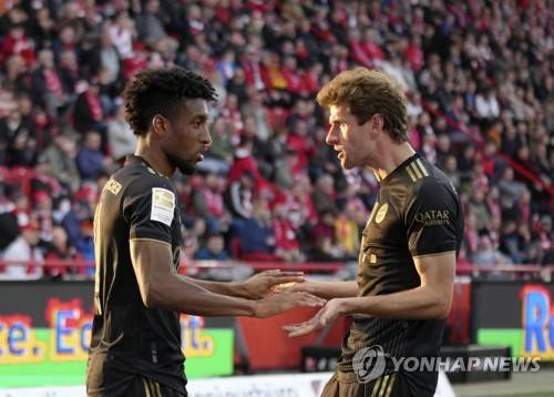Bayern's Kingsley Coman, left, celebrates with Thomas Mueller after scoring his side's fourth goal during the German Bundesliga soccer match between 1. FC Union Berlin and FC Bayern Munich in Berlin, Germany, Saturday, Oct. 30, 2021. (AP Photo/Michael Sohn) The Deutsche Fussball Liga DFL does not allow the images to be used as sequences to emulate video.