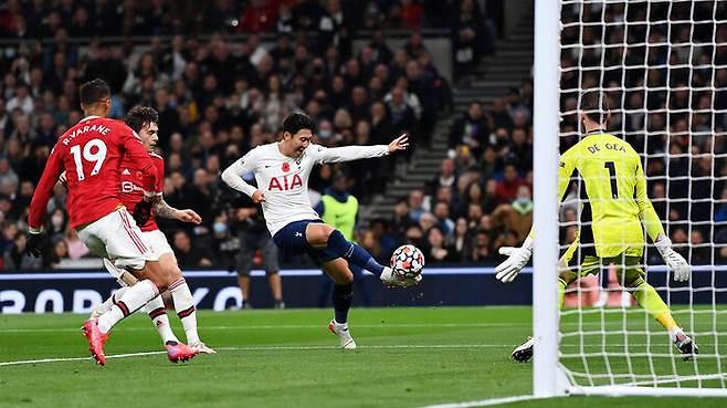 전반 6분, 왼발 중거리슛으로 맨유 골문을 두들기기 시작한 손흥민은 전반 24분 결정적 기회를 잡았습니다.