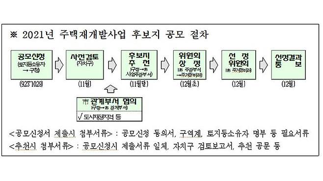 각 자치구는 해당 구역의 정비구역 지정요건 충족 여부 등을 사전 검토해 민간재개발 공모에 적합하다고 판단되는 구역을 4곳 이내로 추려 시에 추천할 예정입니다.