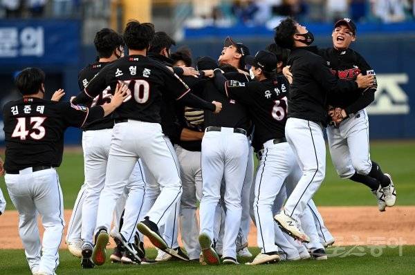 31일 대구 삼성라이온즈파크에서 ‘2021 신한은행 SOL KBO리그’ 삼성 라이온즈와 kt 위즈가 정규리그 1위를 결정짓는 타이브레이커 경기가 열렸다. kt가 삼성을 상대로 1-0으로 승리하며 창단 첫 우승을 차지한 뒤 선수들이 그라운드에서 기쁨을 나누고 있다.