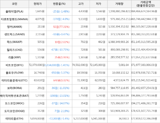 또한, 베이직어텐션토큰(-13.01%, 1,270원), 보라(-11.01%, 291원), 칠리즈(-10.75%, 556원), 플로우(-5.37%, 16,740원), 디센트럴랜드(-4.0%, 4,075원), 도지코인(-2.19%, 312원), 플레이댑(-1.48%, 1,665원), 이더리움(-1.4%, 5,059,000원), 샌드박스(-0.47%, 2,115원)가 하락세를 나타냈다.