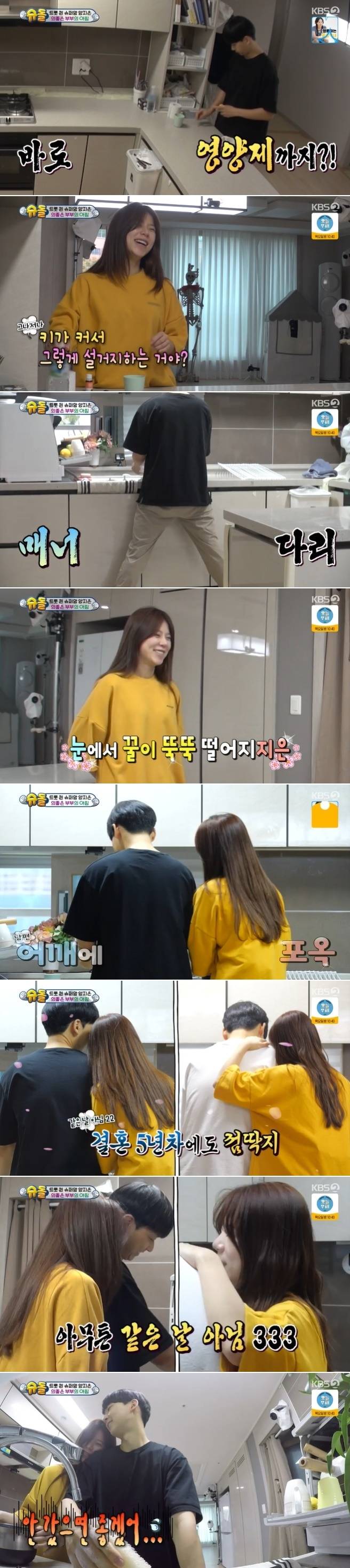 또한, 큰 키 때문에 의도치 않게 매너 다리를 하고 설거지를 하고 있는 남편을 본 양지은은 "설거지 하는 모습이 멋있는데?" "잘생겨 보이는데?"라며 애정을 드러냈다. 이에 소유진은 "신혼 같아 보인다"며 부러워했다.(사진=KBS 2TV '슈퍼맨이 돌아왔다' 방송 캡처)