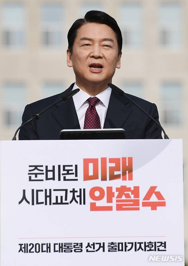[서울=뉴시스] 최진석 기자 = 국민의당 안철수 대표가 1일 서울 여의도 국회 잔디광장 분수대 앞에서 제20대 대통령선거 출마 선언식을 하고 있다. (공동취재사진) 2021.11.01. photo@newsis.com