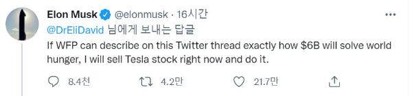 머스크는 현지 시간으로 지난달 31일 자신의 트위터에 "만약 WFP가 60억 달러(약 7조 원)로 어떻게 세계 기아를 해결할 수 있는지를 트위터에 정확히 기술할 수 있다면, 당장 테슬라 주식을 매각해 기부하겠다"라고 글을 남겼습니다.
