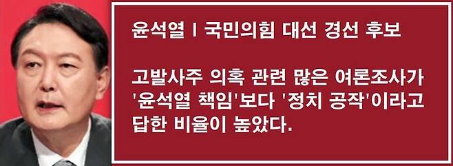 윤석열 후보는 검찰 고발 사주 의혹과 관련 여론조사에 대해, '윤석열 책임'이라는 답변보다 '정치 공작'이라고 답한 경우가 더 많다고 말했습니다.