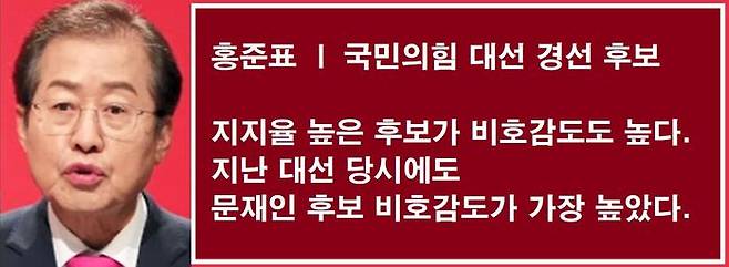 다만, 홍준표 후보가 언급한 "지지율이 높은 후보가 비호감도도 높다"는 주장은 일반적인 경우, 잘못된 해석으로 볼 수는 없습니다. 보통 특정 후보 지지자들은 유력 경쟁 후보에 대한 견제 심리가 클 수밖에 없고, 자연히 상대 후보를 '비호감한다'고 답할 가능성이 크기 때문입니다.