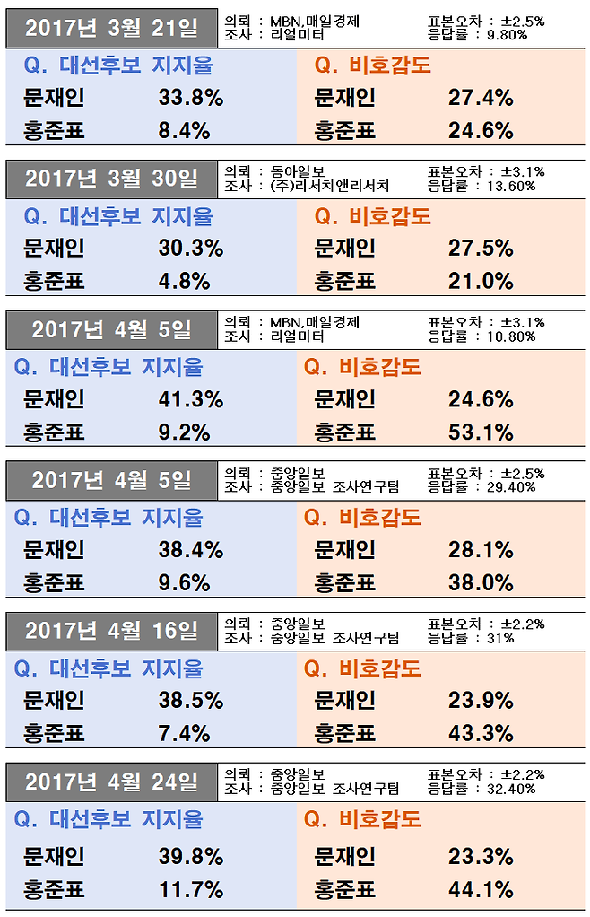 홍준표 후보가 말했던 동아일보 조사의 경우, 문재인, 홍준표 당시 후보의 비호감도는 각각 27.5%, 21.0%로 문재인 당시 후보의 비호감도가 오차 범위 밖에서 더 높은 걸로 나왔습니다.