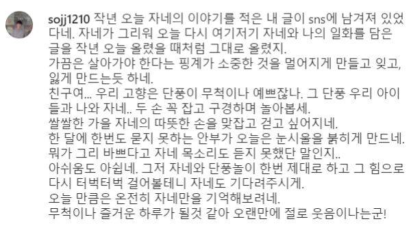 소 작가가 공개한 친구와의 일화는 이미 지난해 소 작가 SNS에 올라온 바 있습니다. 그는 어제(2일) SNS에 "작년 오늘 자네의 이야기를 적은 내 글이 남겨져 있다네. 자네가 그리워 오늘 다시 여기저기 자네와 나의 일화를 담은 글을 그대로 올렸지"라고 밝혔습니다.