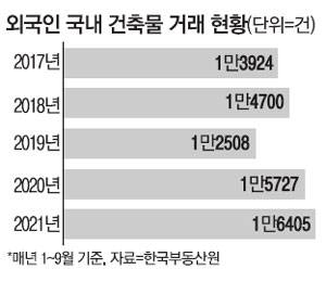 3일 한국부동산원의 건축물 거래(신고일 기준) 통계에 따르면 올해 들어 9월까지 외국인의 국내 건축물 거래량은 1만6405건으로 집계됐다. 2006년 관련 통계가 작성된 이후 1~9월 수치로는 가장 많다. 15년 전인 2006년(3178건)과 비교하면 5배가 넘는다. 연간 기준으로 외국인 거래가 가장 많았던 때는 지난해(2만1048건)였는데 지금 추세가 이어지면 최다 기록을 경신할 가능성이 높다.