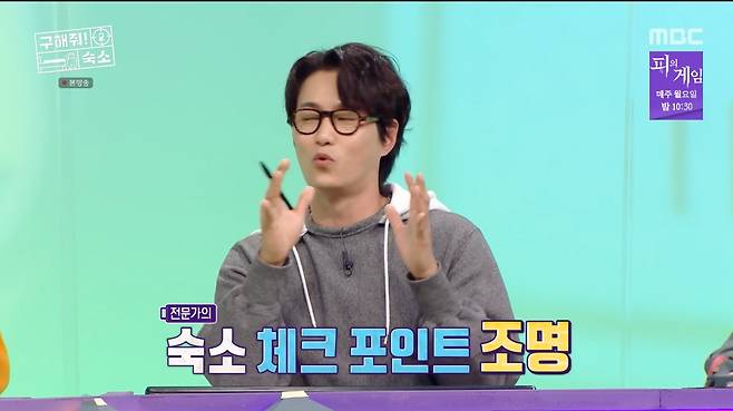 쉬멍팀 김지석은 배우 신다은 남편이자 '구해줘 홈즈'에서 활약 중인 임성빈 소장을 데려왔다. 임소장은 "숙소 체크 포인트는 조명"이라면서 전문가의 카리스마를 발산했다.