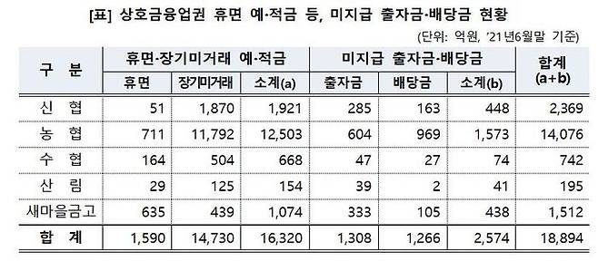 금융위에 따르면 올해 6월 말 현재 상호금융업권에서 고객이 찾아가지 않은 휴면·장기 미거래 예·적금과 미지급 출자금·배당금은 각각 1조6천320억 원과 2천574억 원입니다.